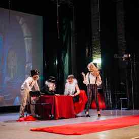 Ощущение уюта, комфорта и настоящей атмосферы театра создано с помощью оригинального оформления: есть импровизированная сцена с кулисами, а стена представляет собой нарисованное огромное изображение зрительного зала.